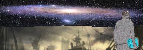 Because he looks out over a cosmic vista: a spiral galaxy nestled in a field of stars. The image is grand, inspiring, hopeful.